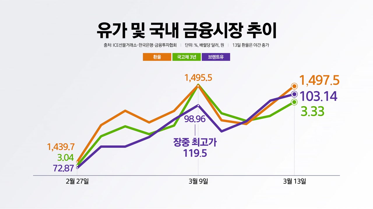 이런 이란 문제 전에도 환율이 워낙 높았잖아요. 그건 아시겠지만 우리 개인투자자분들의 미국 투자 매입도 많았고 기업들의 달러 선호, 이런 것들이 구조적으로 이어지면서 수급 이슈가 좀 있으면서 1400~1500원 사이로 왔다 갔다 했는데 사실 이건 우리나라 펀더멘탈과는 무관하기 때문에 높다고 해도 그렇게 크게 문제 될 것은 아닌데 지금은 문제가 되죠. 지금 환율이 1500원을 이번에 넘어간 것은 불확실성이잖아요. 중동 유가가 어쨌든 100달러 갔다가 저번에 80달러 갔다가 다시 100달러까지 온 상황인데 고유가가 장기화되먼 한국 경제 자체가 중동에서 오는 원유 의존도가 높은 경제구조를 갖고 있다 보니까 이게 원화 가치에 그대로 반영되거든요. 그러니까 기본적으로 달러 수요가 많은 수급 상황 속에서 불확실성까지 가중되니까 원달러 환율이 1500원 레벨을 넘어서는 그런 모습이 나왔는데 그런데 정부에서는 이걸 어떻게 방어하려는 모습들이 나올 수 있고 지난번에도 1480원 넘었을 때 개입을 좀 해 줬거든요. 그래서 정부도 방어에 나서겠지만 그건 근본적인 해결책이 되기는 어렵고 국제유가가 100달러 가는 것보다도 빨리 아랫쪽으로 안정화되는 모습이 나와야 하는데 100달러 이상에서 장기화된다면 우리나라 원달러 환율 레벨도 1500원대에서 머물 가능성도 있거든요. 그래서 결국 이건 우리가 결정할 수 없는 요인이고 국제 정세가 결정할 수밖에 없는 그런 상황인 것 같습니다.