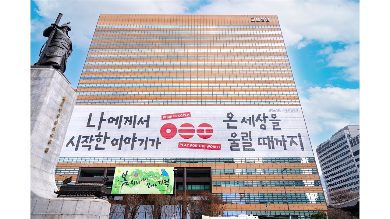 교보생명은 방탄소년단 소속사 빅히트 뮤직과 협업해 사옥 외벽에 세계를 무대로 자신만의 이야기를 써내려 가는 BTS처럼 모든 시민들이 도전하고 노력해 자신의 잠재력을 꽃 피우고 더 큰 세상을 향해 나아가자는 희망의 메시지를 표현했다고 밝혔습니다.