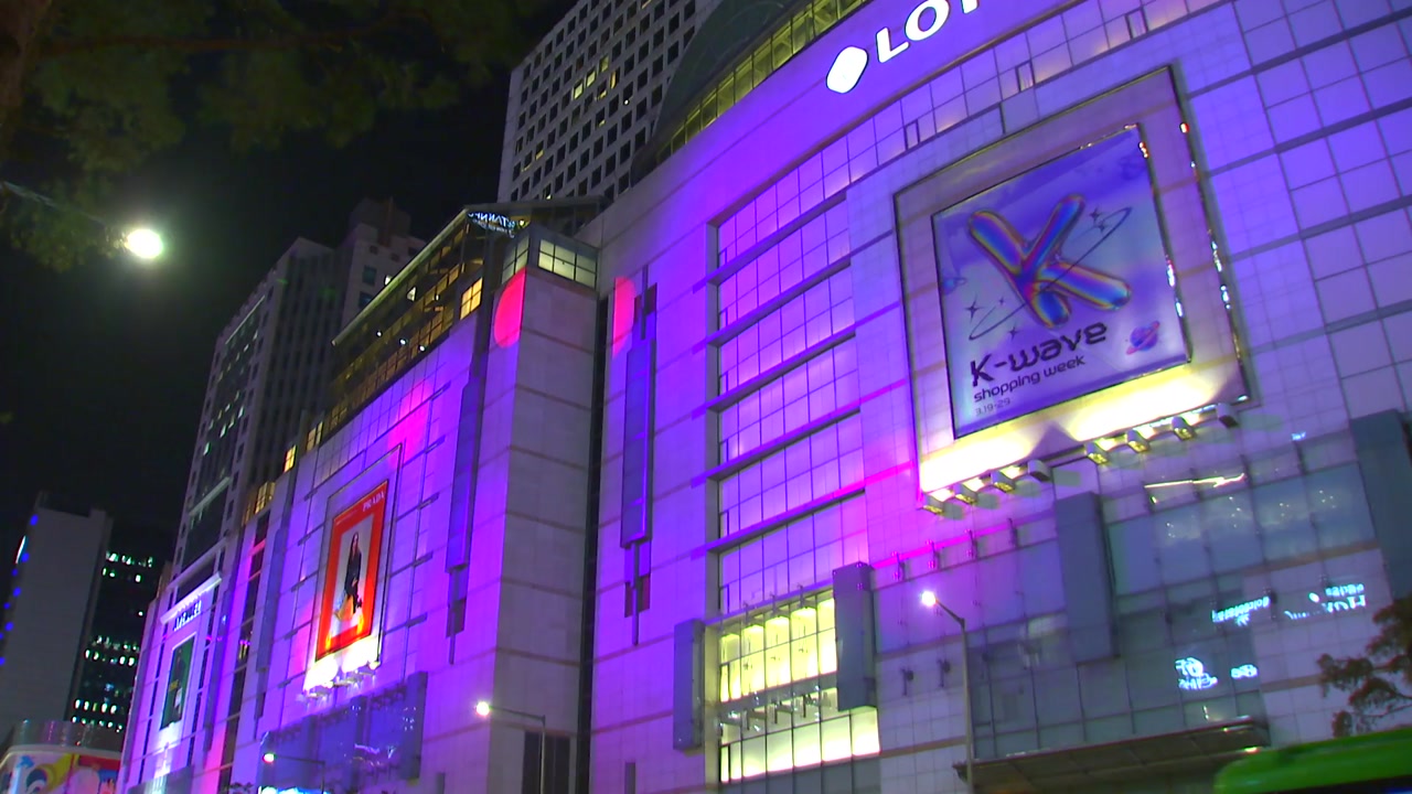 BTS 공연을 앞두고 백화점 외벽까지 보라색 조명으로 바뀌었습니다.