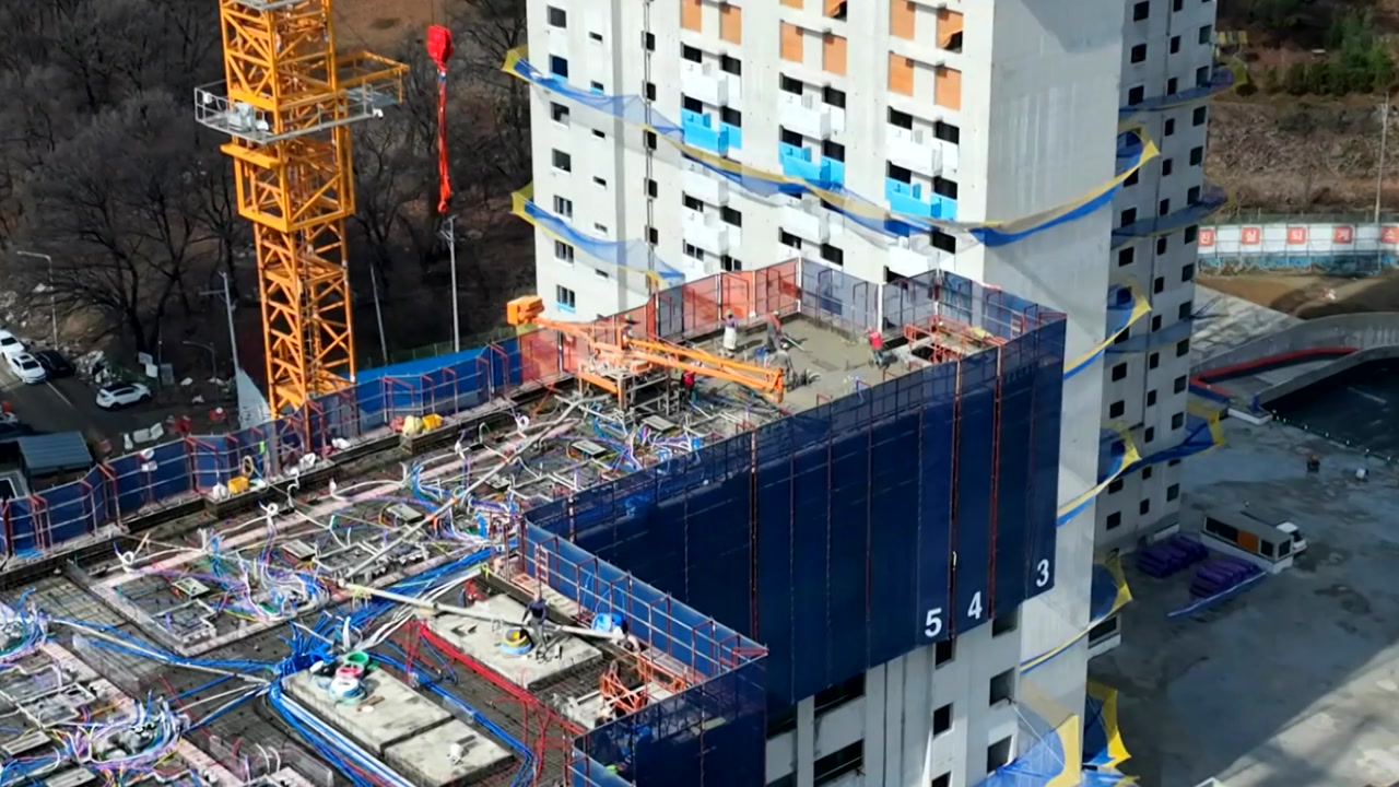 이곳은 천4백 세대짜리 아파트를 짓는 현장인데, 콘크리트 골조 공사를 하며 층수를 계속 올리고 있습니다.