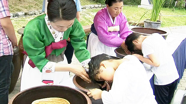 이곳 체험 행사장에서는 조상들이 했던 것처럼 어린이들이 창포물에 직접 머리를 감고 있습니다.