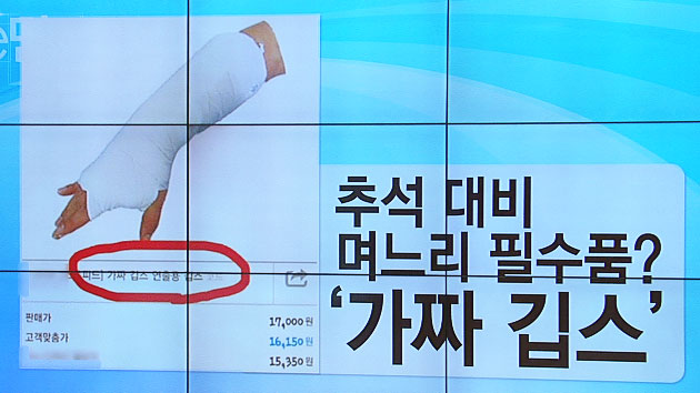 이 깁스는 원래 연극 소품 등으로 주로 쓰였는데요, 추석 시즌이 되자 명절증후군을 앓던 주부들이 이 깁스를 찾기 시작한 겁니다.
