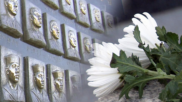 보시는 것처럼 제 뒤로는 희생된 장병 46명의 얼굴이 각각 새겨진 부조가 추모객들을 맞고 있습니다.