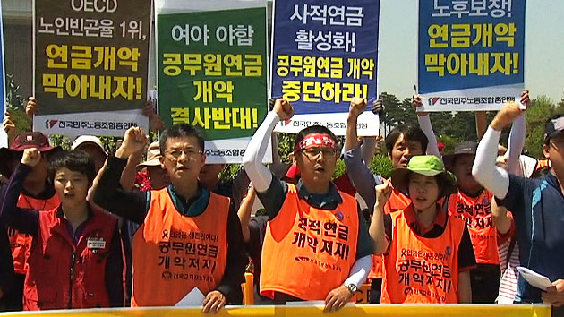 민주노총 소속 조합원 150여 명은 국회 앞에서 기자회견을 열고 국회가 지난 2일 합의한 공무원연금 개정안이 노후 빈곤 해결과 노후 소득 보장이라는 공적연금의 목표를 담고 있지 않다고 비판했습니다.