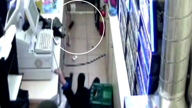 잠시 후 계산대 안으로 달려가더니 여성 종업원을 사정없이 때립니다.