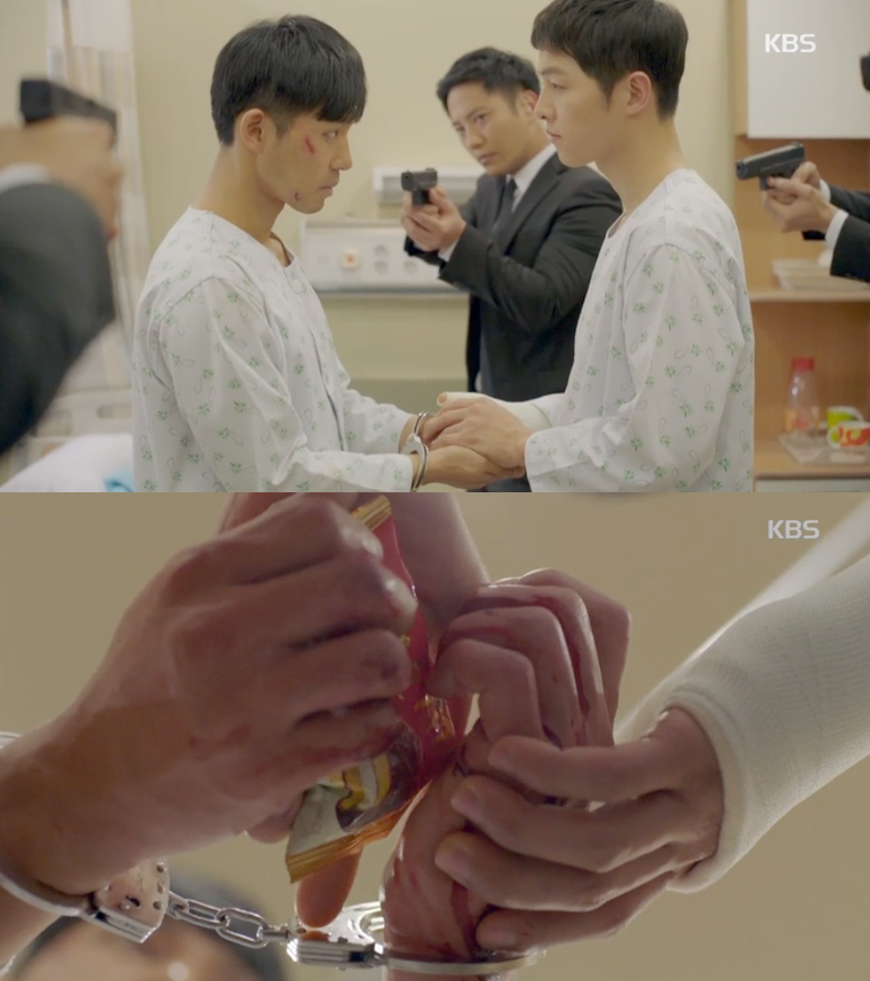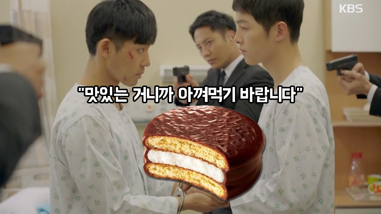 초코파이가 등장하는 장면에서 유시진 대위는 북한군 안정준 상위에게 "작별 선물입니다. 맛있는 거니까 아껴먹기 바랍니다"라며 초코파이를 건넵니다.