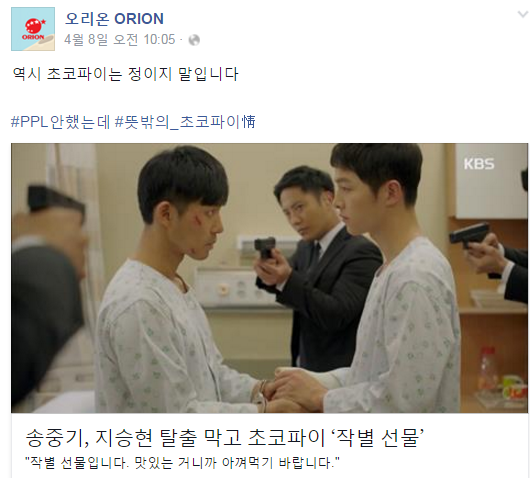 드라마 '태양의 후예' 속 초코파이의 간접광고(PPL) 논란과 관련해 오리온이 재치있는 해명을 내놔 화제입니다.