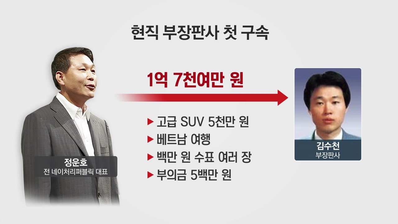 인천지방법원에서 부장판사로 근무를 하고 있었고요. 이번에 혐의는 네이처리퍼블릭 대표죠. 그 사람으로부터 레인지로버 승용차를 맨 처음에 5000만 원을 주고 중고차를 매입을 했는데 그걸 다시 돌려받았어요. 그러니까 사실상 화면에 나오고 있는데 정운호 대표하고 베트남 여행도 많이 다니고 그리고 계좌로 수표, 가족의 계좌로 수표가 입금이 된 것까지 확인이 됐습니다. 그리고 부의금이라는 명목으로 500만 원을 준 것. 이 모든 것을 포괄적으로 뇌물이라고 판단을 한 건데요.