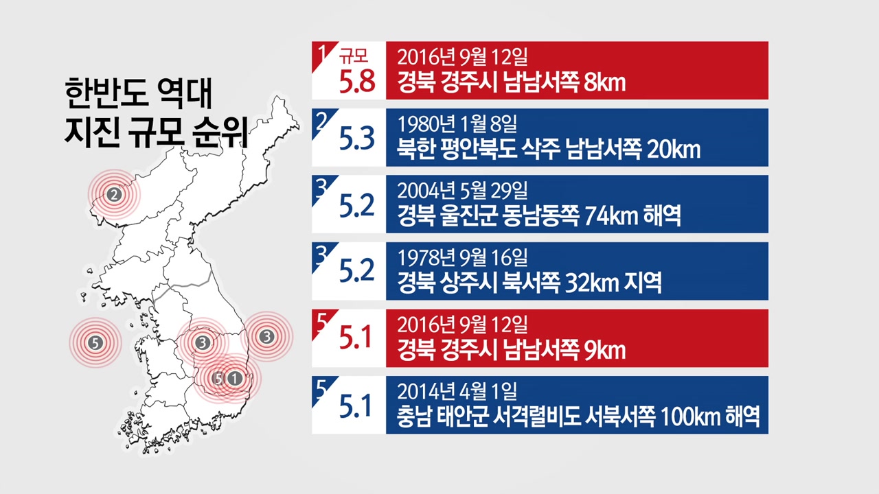 지금 한반도 역대 지진 규모 순위를 쭉 보시면 아시겠지만 지금 빨간색으로 표시되어 있는 역대 1위와 5위의 규모가 바로 어제 저녁에 있었던 지진이고요.