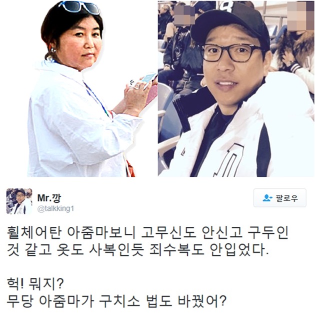 사진과 함께 강병규는 "휠체어 탄 아줌마보니 고무신도 안신고 구두인것 같고 옷도 사복인듯 죄수복도 안입었다. 무당 아줌마가 구치소 법도 바꿨어?"라는 글을 올렸다.