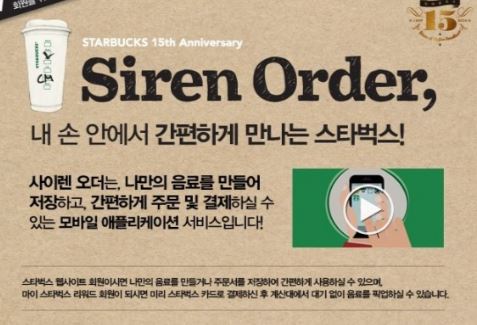 '사이렌 오더'는 줄을 서지 않고도 애플리케이션으로 주문을 할 수 있는 기능이다. 스타벅스의 사이렌 오더는 주문 방법을 혁신적으로 바꿨다는 평가를 들으며 순항하고 있다. 스타벅스는 정책상 진동벨을 주지 않지만, 사이렌 오더를 이용하면 내 음료가 언제 나왔는지 알 수 있어서 편리하다. 실제로 이용 고객의 절반 이상이 '사이렌 오더'를 이용해봤다고 밝혔다.