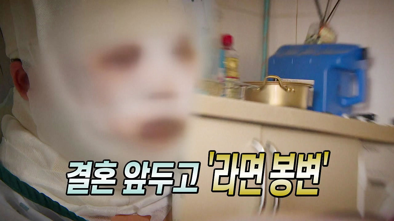 먼저 첫 번째 키워드 확인해 보시죠. 결혼을 앞둔 예비 신부가 그야말로 라면 봉변을 당했습니다. 그러니까 함께 살고 있는 룸메이트가 펄펄 끓는 라면을 냄비째 들이 부은 거죠?