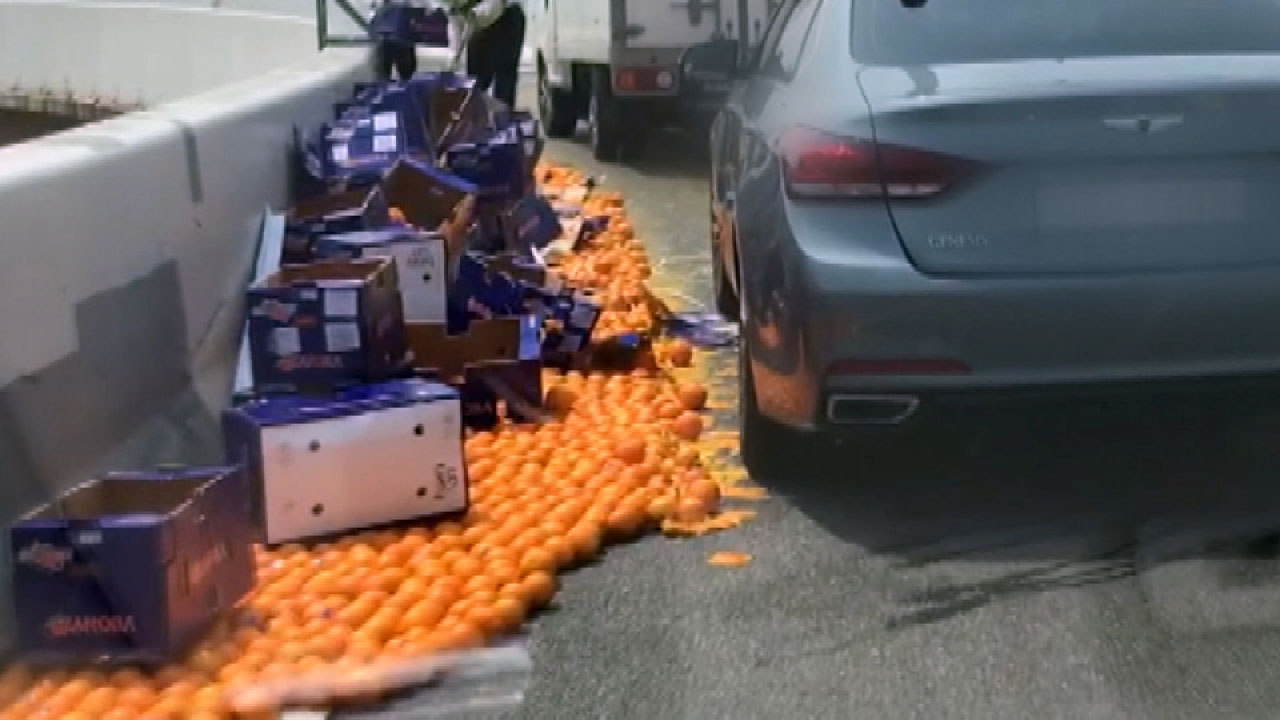 이 사고로 다친 사람은 없었지만, 오렌지 5천여 개가 도로를 막으면서 2시간 동안 해당 구간 운행이 통제됐습니다.