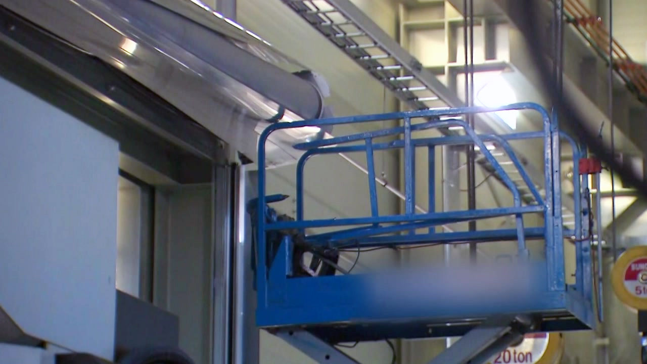5m 높이의 철판 문틀과 작업대 난간이 맞붙은 채 멈춰있고 주변에는 경찰 통제선이 쳐 있습니다.