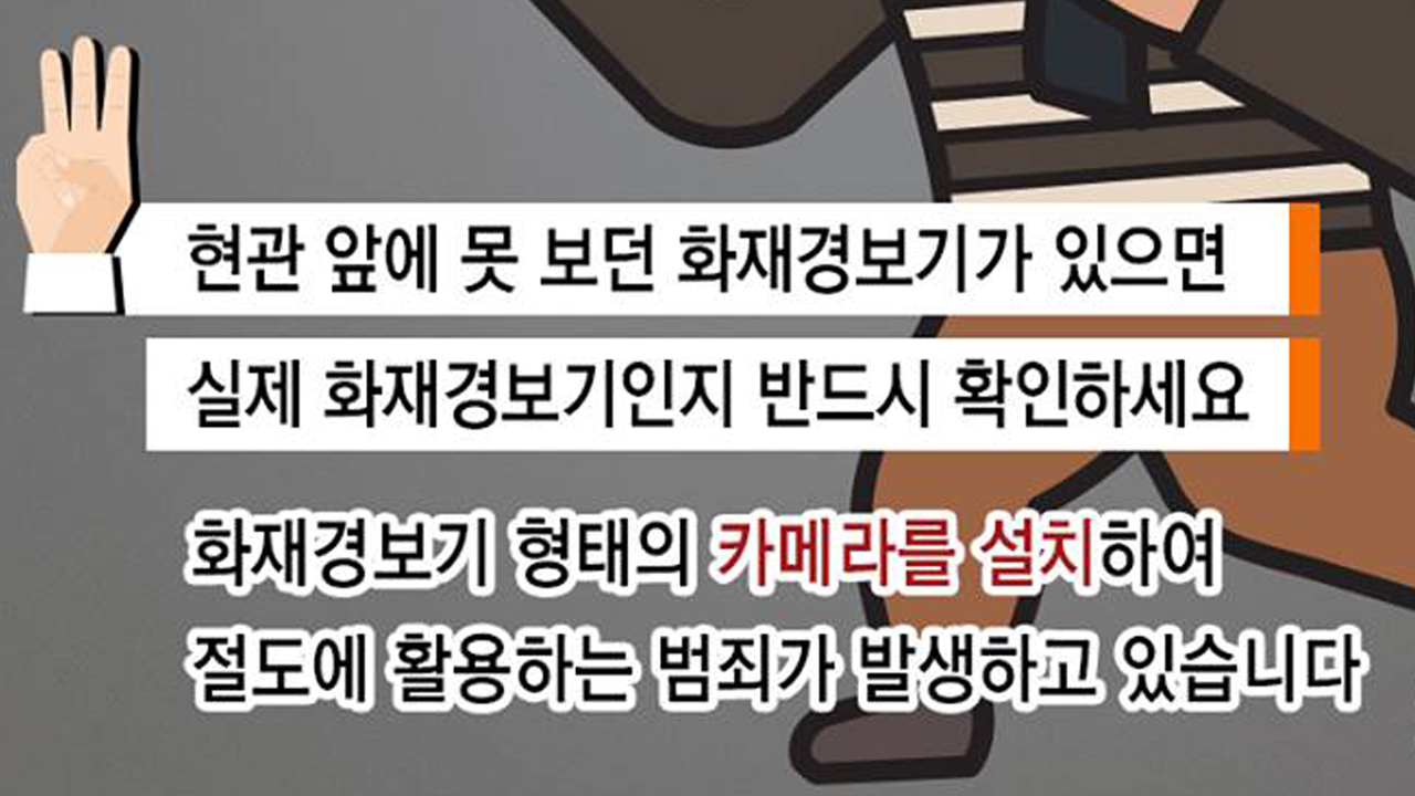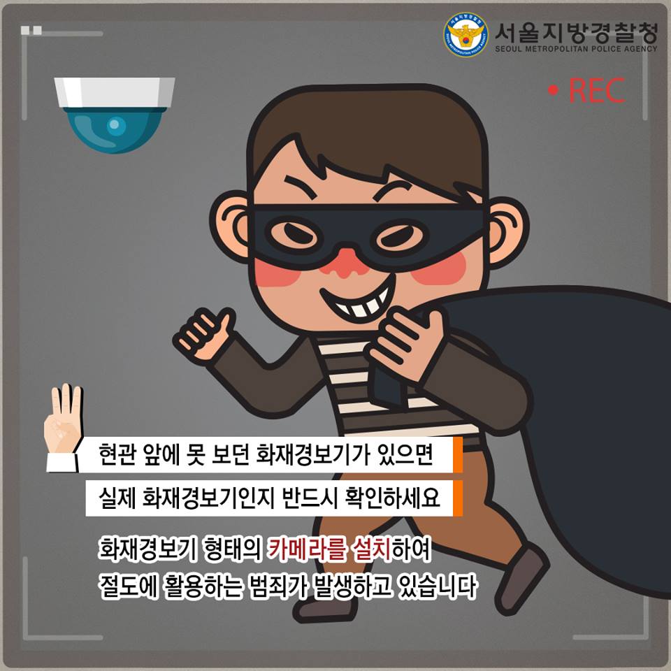 이어 서울지방경찰청은 화재경보기를 언급하며 "현관 앞에 못 보던 화재경보기가 있으면 실제 화재경보기인지 반드시 확인하라"며 "화재경보기 형태의 카메라를 설치하여 절도에 촬영하는 범죄가 발생하고 있다"고 강조했다.