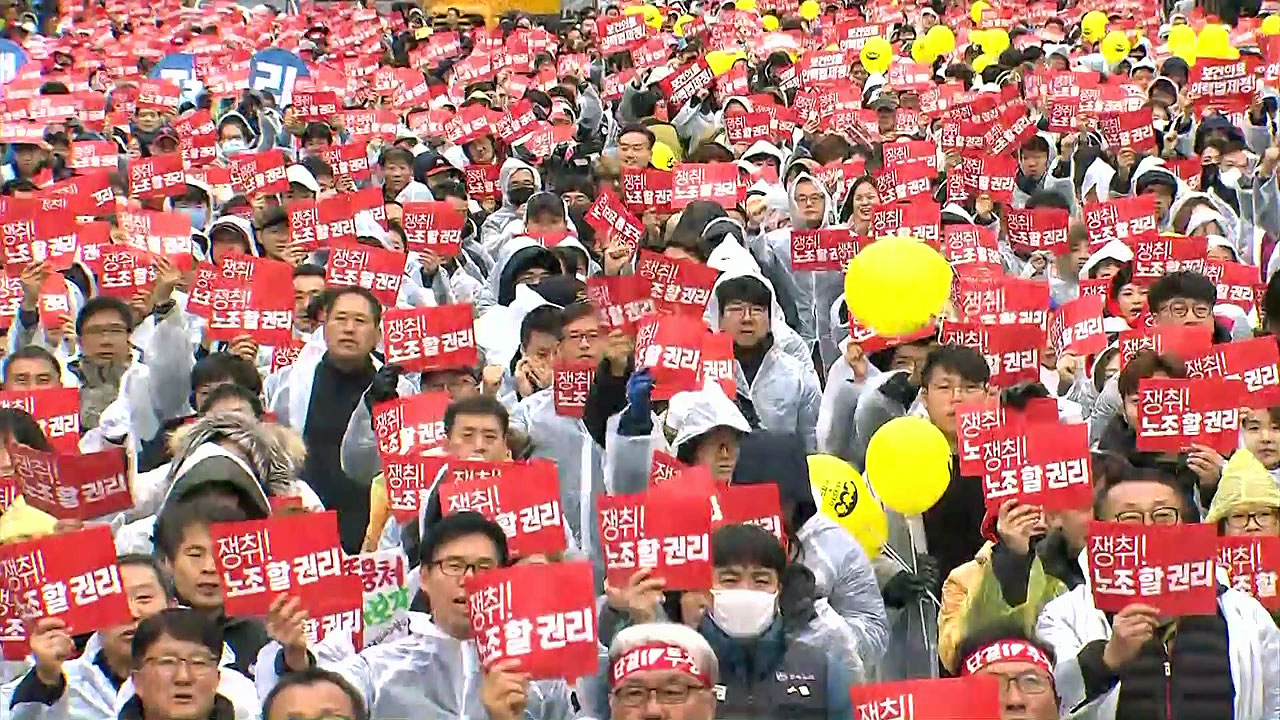 민주노총은 여의도 국회 앞을 포함한 전국 13곳에서 탄력 근로 확대 합의 철회와 ILO 핵심 협약 비준을 요구하며 총파업 대회를 진행합니다.