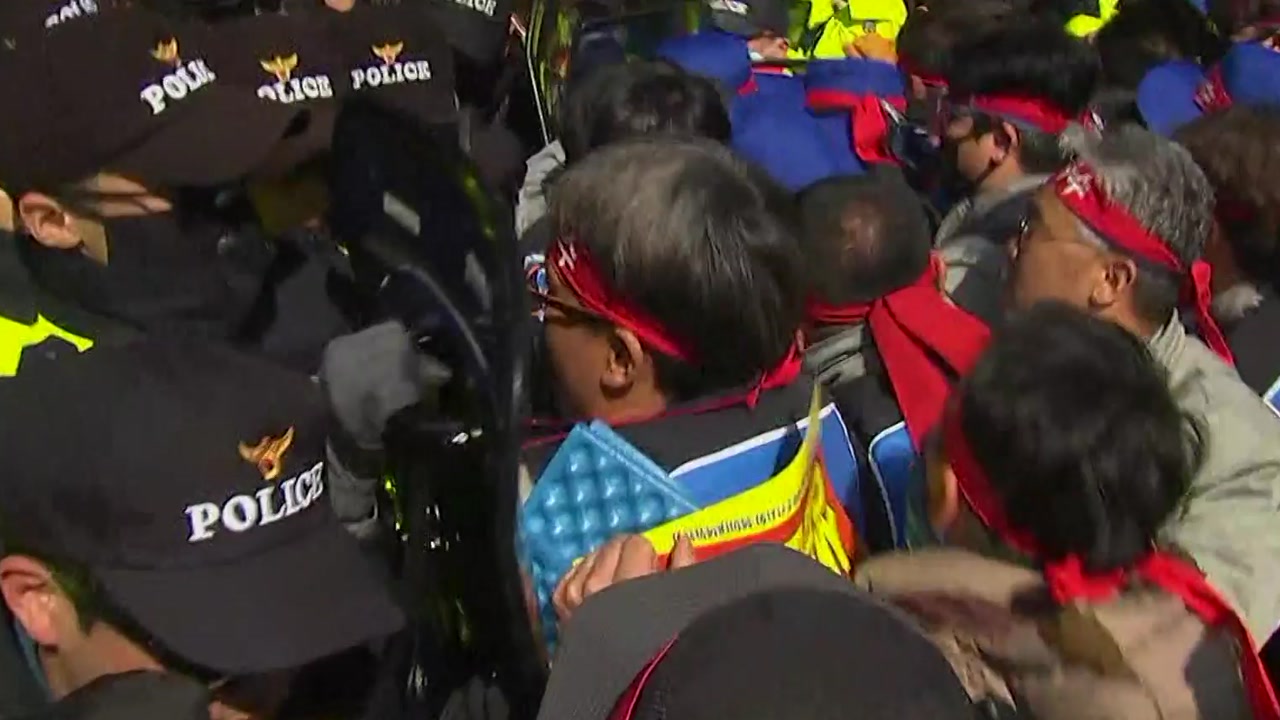 회사 매각에 반대하며 상경 투쟁에 나선 대우조선해양 노동조합원들이 경찰과 충돌을 빚고 연행됐습니다.