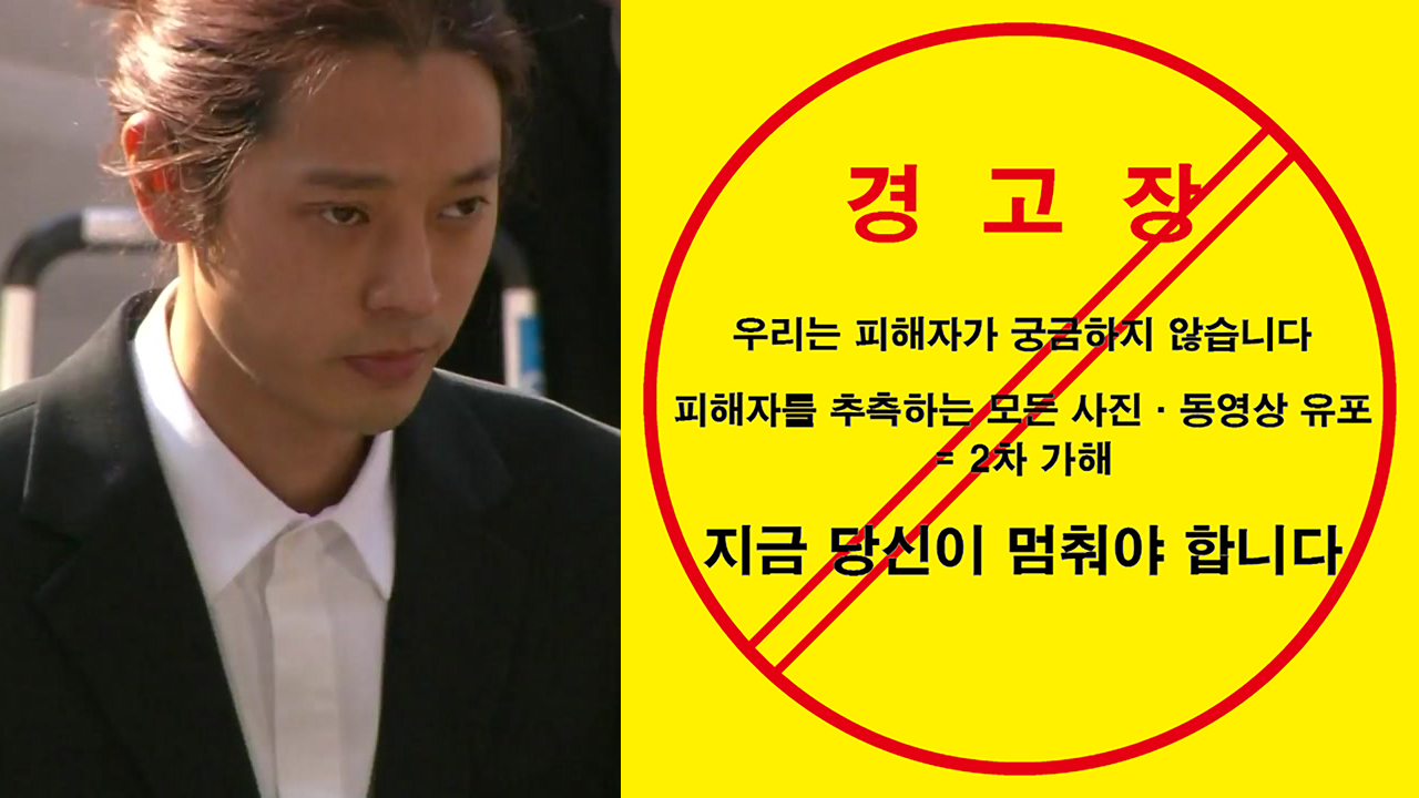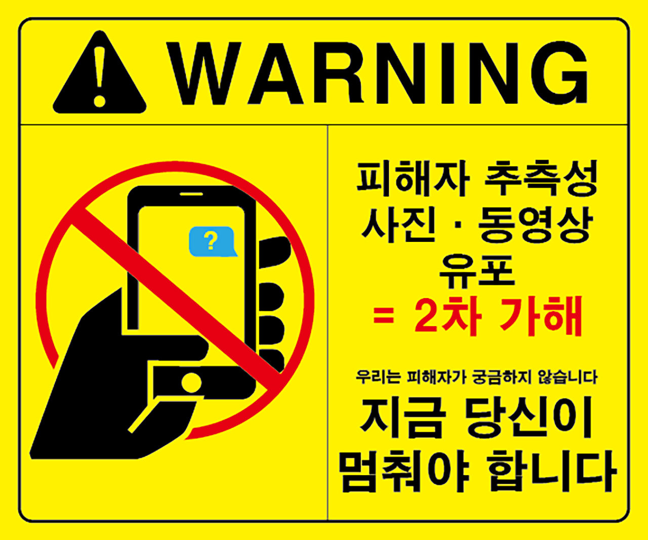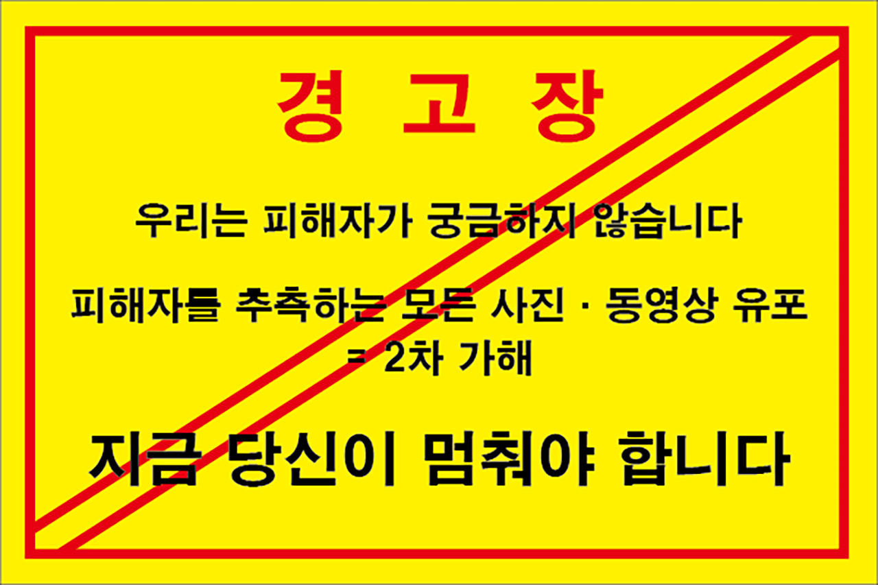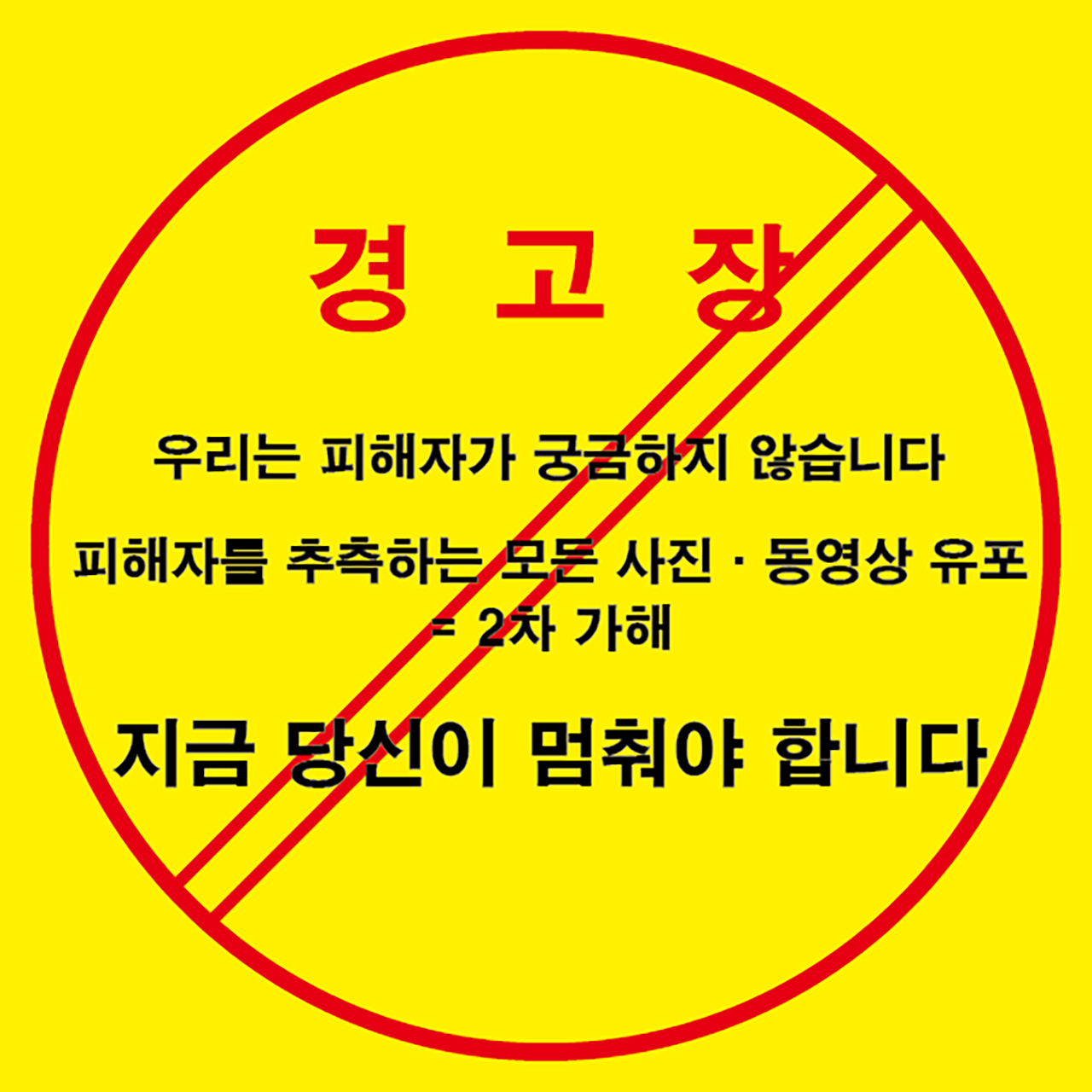노란색 바탕의 이 이미지는 '경고장'을 형상화했다. 여기에는 "우리는 피해자가 궁금하지 않습니다", "피해자를 추측하는 모든 사진과 동영상 유포는 2차 가해", "지금 당신이 멈춰야 합니다"라는 문구가 적혔다.