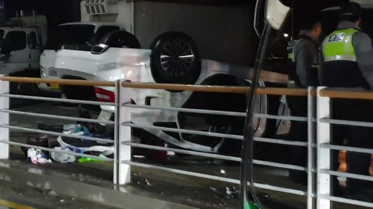 오늘 새벽 2시 반쯤 경기도 남양주시 진접읍에서 인도 쪽 가드레일을 들이받은 승용차가 공터에 주차한 화물트럭 2대를 잇달아 충돌한 후 전복됐습니다.