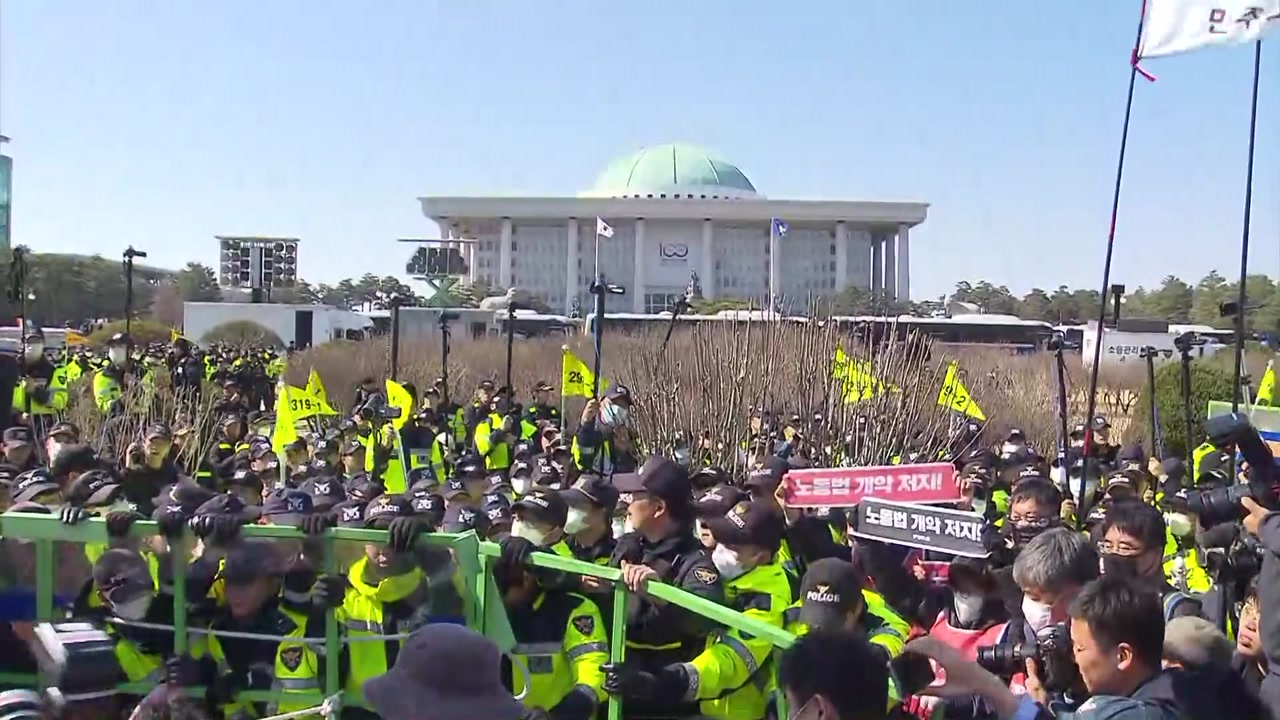 어제 민주노총 김명환 위원장 등 조합원 20여 명이 국회 진입을 시도하다 경찰에 연행됐는데요.