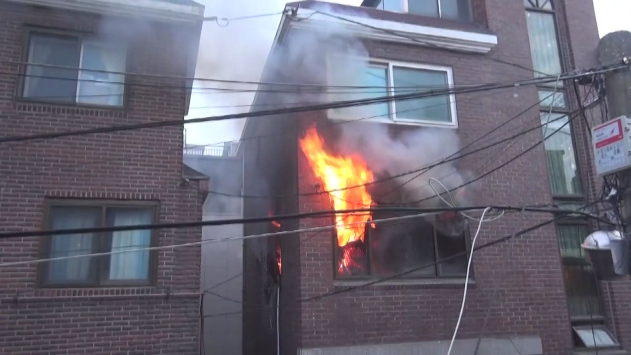 다세대 주택 2층 창문으로 불길과 검은 연기가 뿜어져 나옵니다.