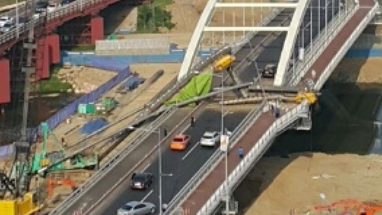 남부순환로 안양교 확장공사 도중 대형 크레인이 다리 위로 넘어졌습니다.
