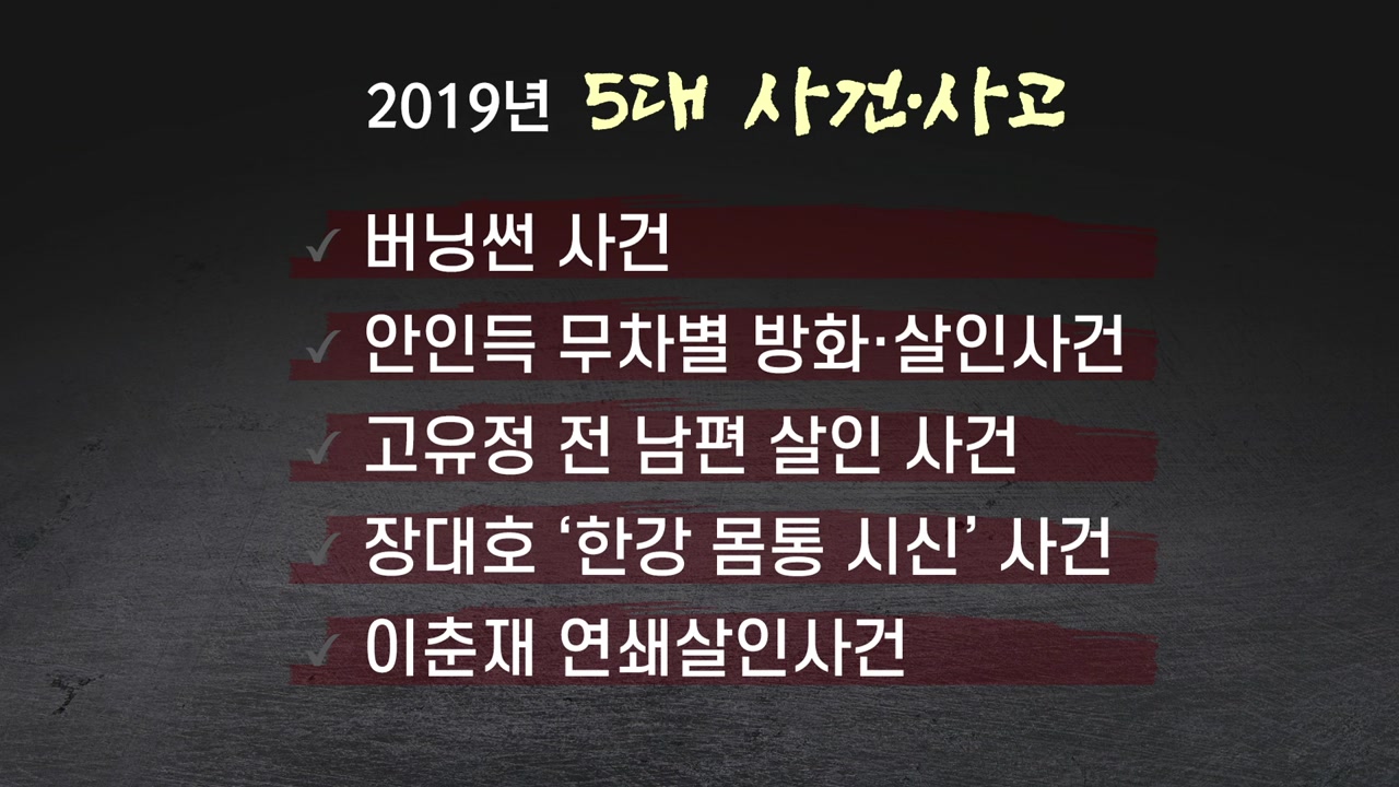 그밖에 두 번째 사건으로는 지금 비뚤어진 공인들의 문제, 아까 버닝썬 문제도 나왔습니다마는 YG 사건, 또는 정준영이나 최종훈 사건, 그 밖에 재벌3세들 또는 가수 여러 이런... 공인 계통이라고 할 수 있는 분들의 비뚤어진 행위로 인해서 국민들에게 많은 실망감을 줬던 사건들도 역시 올해의 특징적인 사건 중 하나였고. 마지막으로 본다면 고유정 사건이 또 우리 사회에서 굉장히 좀 문제를 많이 야기했는데 전 남편을 상당히 잔인하게 살해하고 나서도 뻔뻔스럽게 자기가 성폭행을 피하려고 하다가 했다. 주장을 함으로써 또 문제가 됐고 더불어서 의붓아들 살인사건까지 의혹을 받고 있어서 이 사건도 올해 상당히 사회적으로 문제가 됐던 사건이라고 볼 수 있겠습니다.