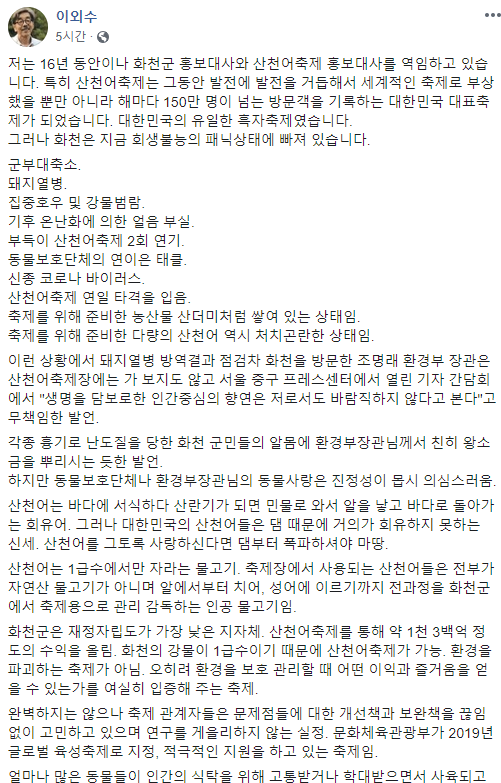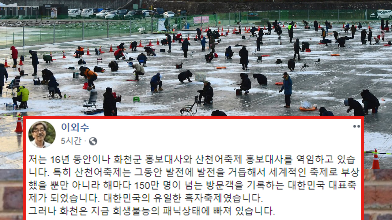 조명래 환경부 장관이 강원 화천산천어축제를 비판하자 화천군과 산천어축제 홍보대사를 지낸 소설가 이외수 씨가 "축제장에 가보지도 않은 무책임한 발언"이라며 목소리를 높였다.