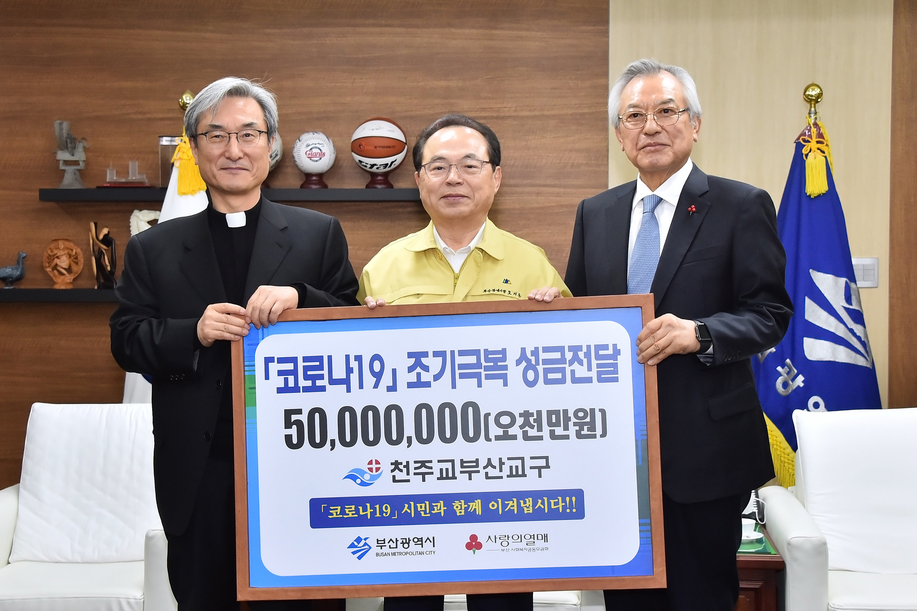 천주교 부산교구 권지호 총대리 신부는 "코로나19 종식을 위해 전력을 다하는 의료기관과 부산시 공무원들에게 감사하며, 시민들이 일상의 삶으로 빨리 돌아갈 수 있도록 함께 어려움을 극복하자"며 부산의 거점병원 의료진과 정부의 미지원 사회복지 시설 등에 써달라고 했다.