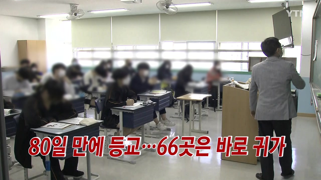 ■ 전국의 고3 학생 40여만 명이 80일 만에 등교해 수업을 받았습니다. 하지만 등교 첫날, 인천의 고3 2명이 확진 판정을 받으면서 60여 개 학교에서 등교가 연기되거나 곧바로 수업이 중단됐습니다.
