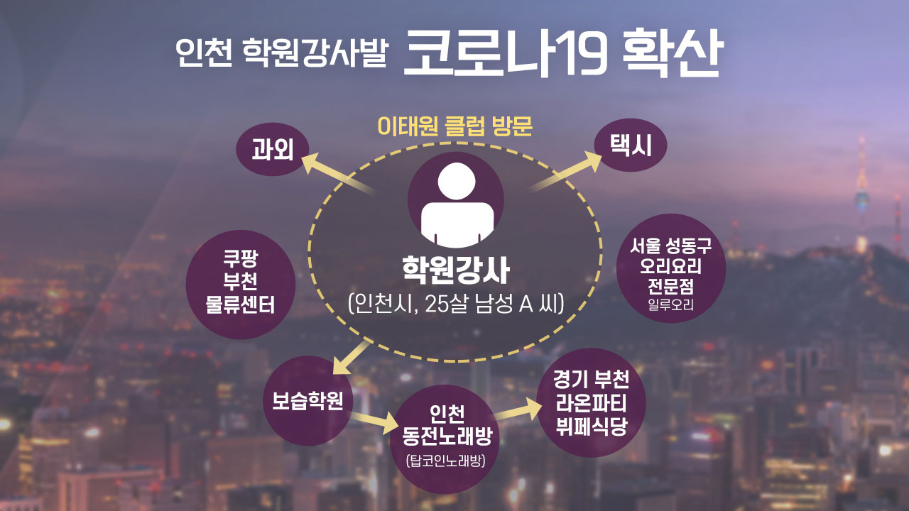 보습학원, 동전 노래방에 이어 뷔페와 식당, 대형 물류센터 쿠팡으로 새롭게 번지면서 관련 확진자가 50명을 넘었습니다.
