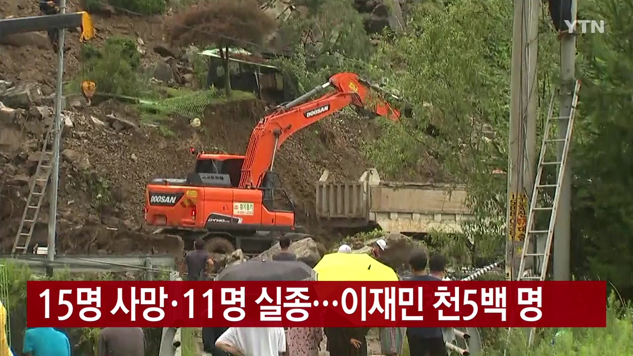 ■ 수도권과 중부지방에 나흘째 이어진 집중호우로 15명이 숨지고 11명이 실종됐습니다. 이재민은 천 명을 넘어섰고, 시설물 피해는 모두 4천2백여 건으로 집계됐습니다.