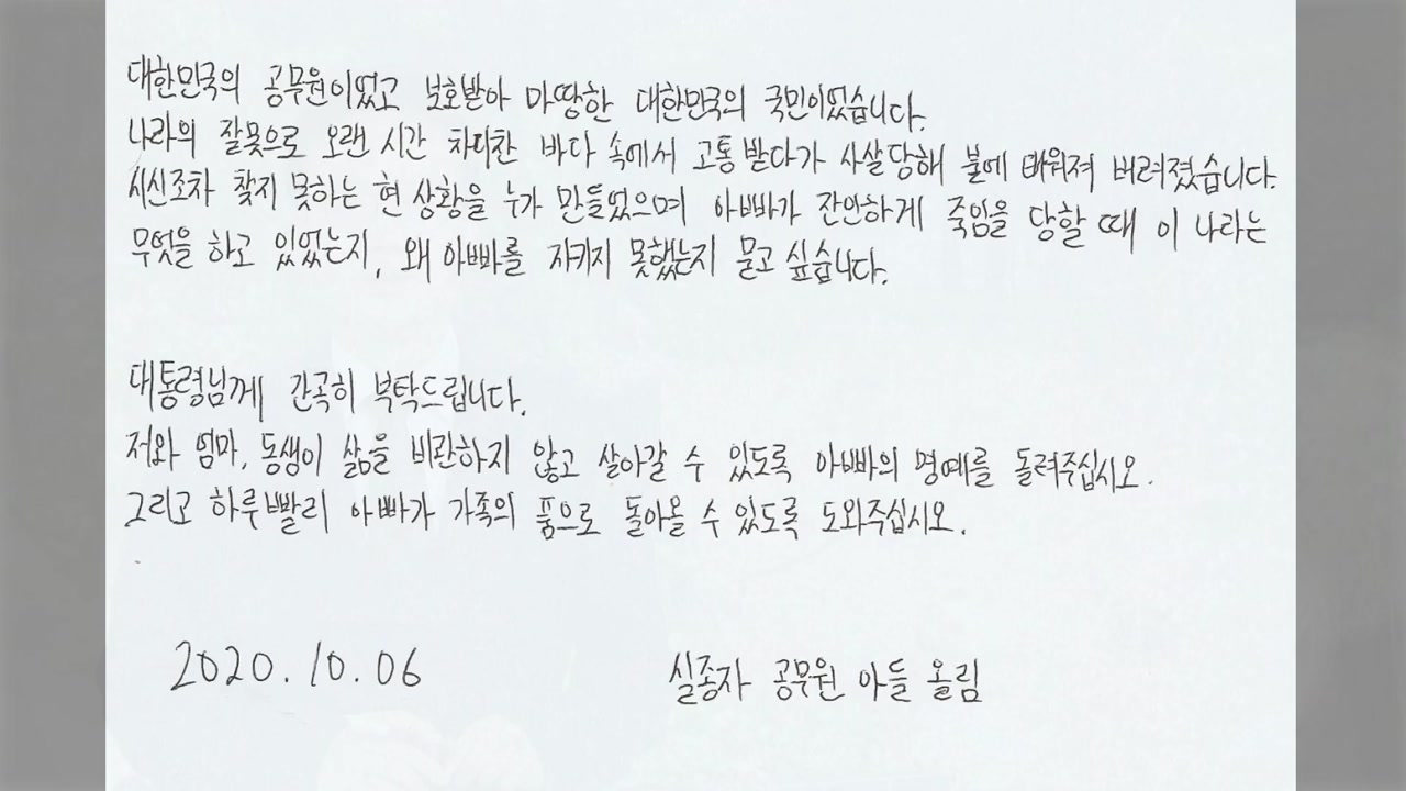 북한에 피살된 공무원의 고등학생 아들이 문재인 대통령에게 보낸 편지가 공개됐습니다.