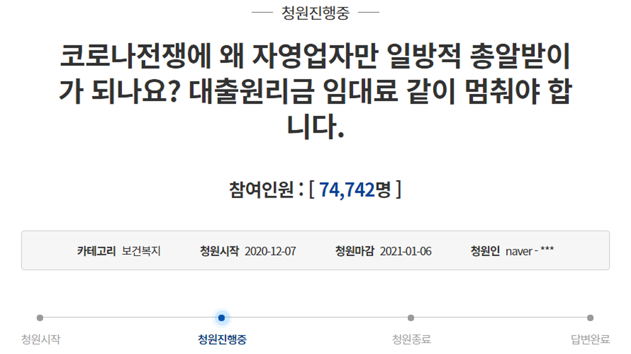 지난 7일 청와대 국민청원 게시판에는 '코로나 전쟁에 왜 자영업자만 일방적 총알받이가 되나요? 대출 원리금, 임대료 같이 멈춰야 합니다'라는 제목의 글이 올라왔다.