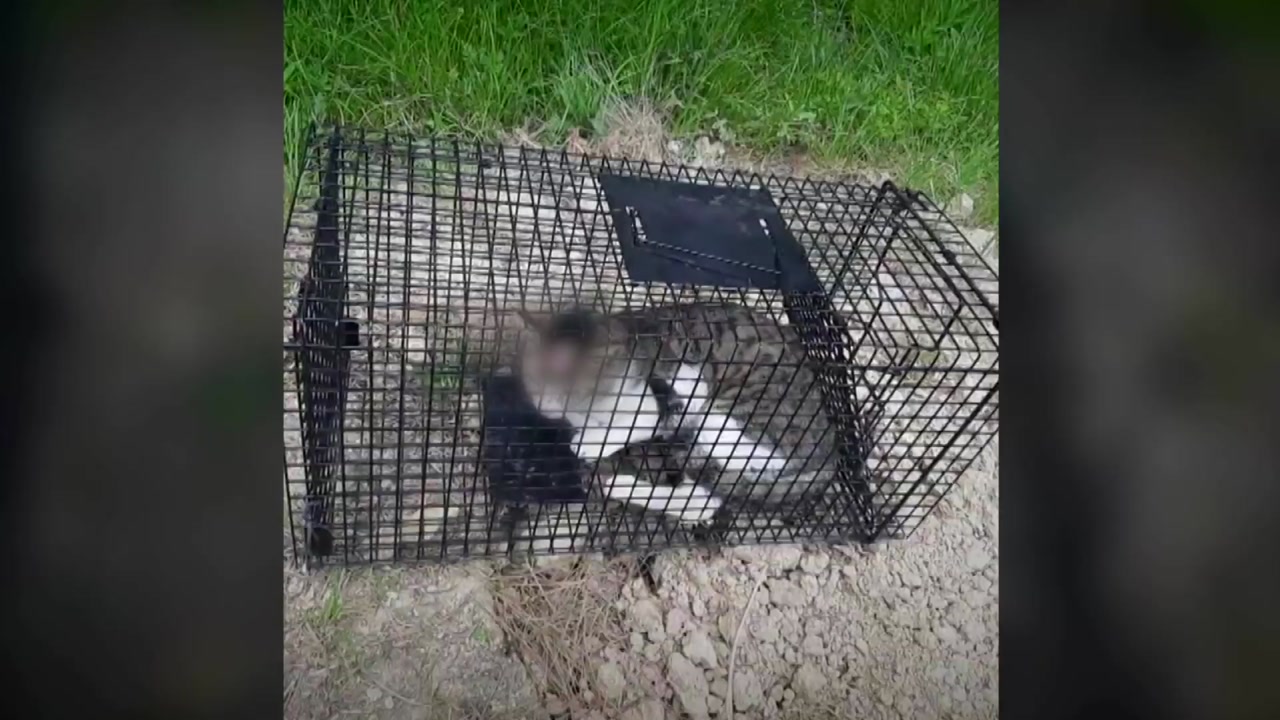 포획틀에 갇혀 있는 고양이, 이마가 벗어져 빨간 속살이 드러났습니다.