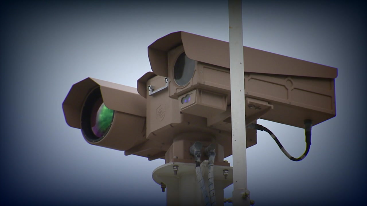 10m 높이 철탑에 열 영상 감시 장비, TOD가 달려 있습니다.