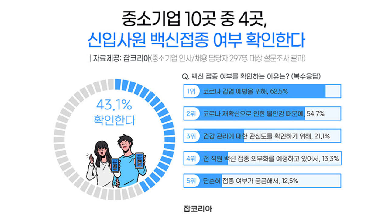 백신 예방접종이 순차적으로 진행되고 있는 가운데, 중소기업 10곳 중 4곳은 채용 시 신규 입사자에게 백신 접종 여부를 확인하는 것으로 나타났다.