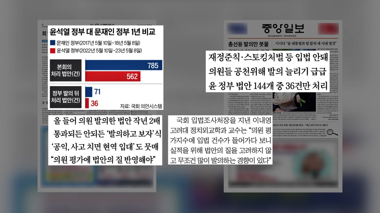 그렇습니다. 여소야대에다가 여야의 갈등이 워낙 극심하다 보니까 어느 정도 예상했던 결과인데요. 기사 내용 함께 보시겠습니다. 작년 5월 10일부터 어제까지 국회 본회의에서 처리된 법안 수는 562건입니다. 지난 정부 집권 1년 때 785건의 법안이 처리된 것과 비교해 30% 가까이 줄어든 수치였습니다. 게다가 정부가 발의한 뒤에 입법된 경우로 국한해 보면 144개를 국회에 제출해 36건만 처리됐는데요. 전 정부가 같은 기간 71건을 처리한 것과 비교하면 정부의 정책 추진 동력이 반 토막 났다고 볼 수 있겠습니다. 이런 가운데 올해 개별 의원들이 발의한 법안은 2300건을 웃도는데 작년 같은 기간 1천 1백여 건이었던 것과 비교해 두 배가 넘는 수준이었습니다.