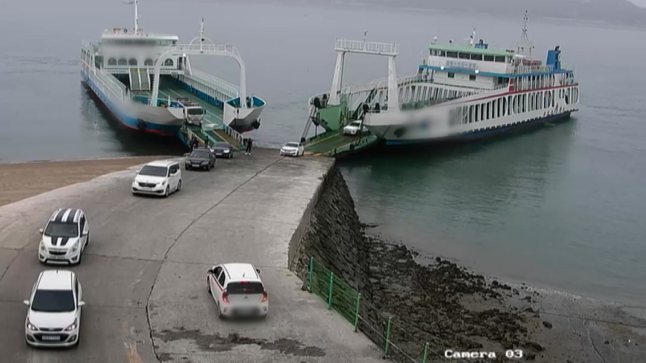먼저 도착한 여객선에서 차량이 줄지어 내리는 동안, 뒤따르던 여객선도 나란히 정박합니다.