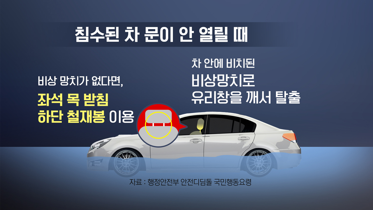 하지만 그 수위를 넘기거나 차 이동이 어려운 상황이라면 곧장 차를 두고, 신속히 밖으로 나가야 합니다.