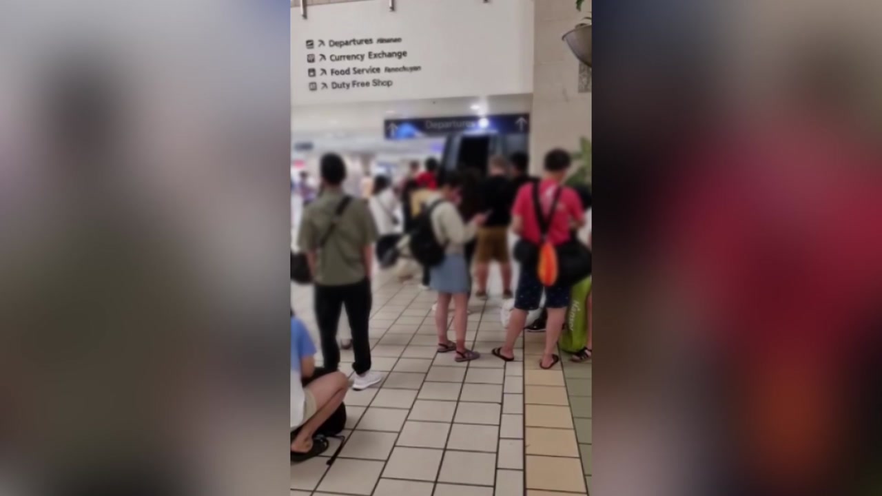 현지시각으로 오늘 새벽 0시쯤 괌 국제공항 측은 여행객들을 모두 공항 밖으로 내보내고 탑승 수속 절차를 일시 중단했습니다.