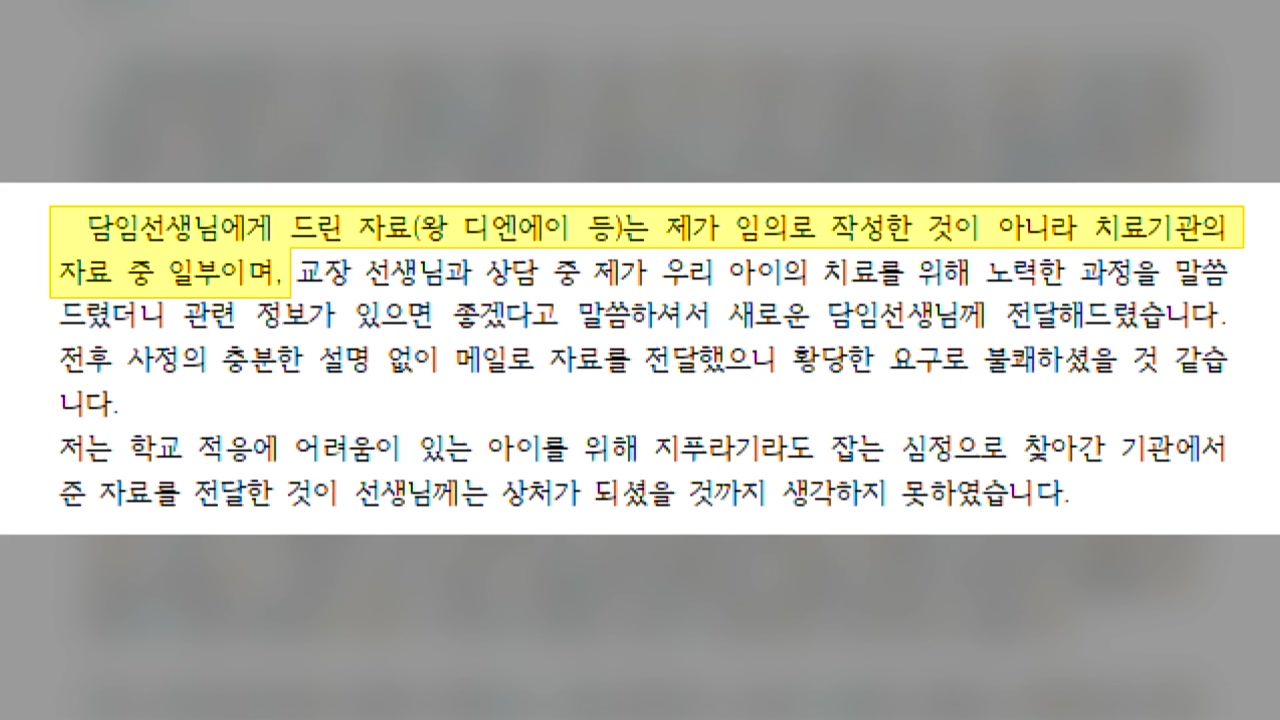'왕의 DNA를 가진 아이'란 표현 등은 아이가 치료받던 기관 자료 중 일부인데 전후 사정의 충분한 설명 없이 메일로 전달했으니 담임교사가 불쾌했을 것 같고 기관 자료를 전달한 게 교사에게 상처가 될 거로 생각지는 못했다고 말했습니다.