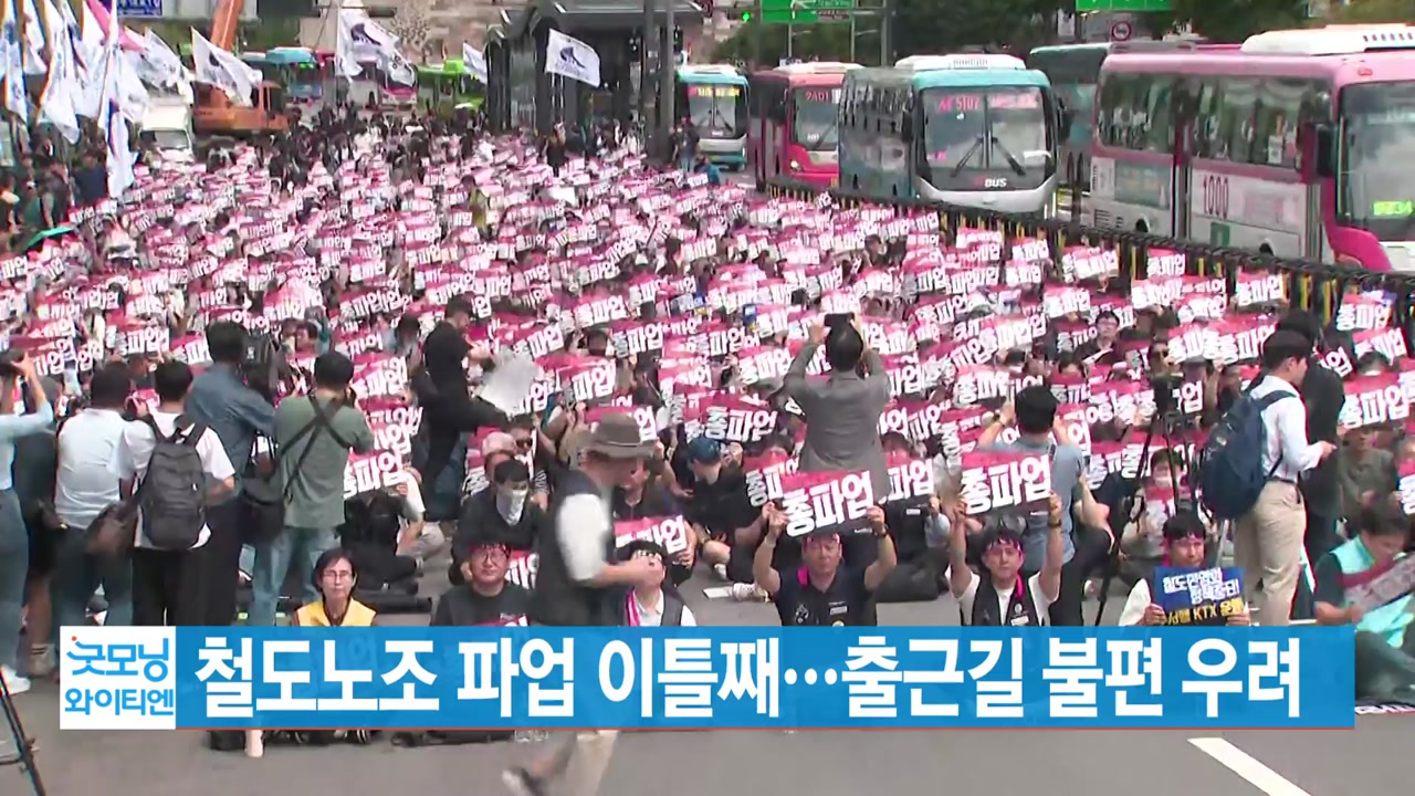 ■ 철도노조가 수서행 KTX 도입 등을 요구하며 총파업을 벌인지 이틀째를 맞아 오늘 아침 출근길 불편도 이어질 것으로 보입니다. 코레일은 출근 시간대 수도권 전철 운행률을 평시 대비 90% 이상 수준으로 유지하겠다고 밝혔습니다.