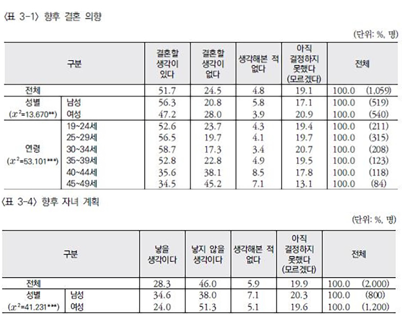 우리나라 성인의 절반가량만 결혼할 의향이 있으며, 향후 아이를 낳을 생각이 있는 성인은 28%에 불과한 것으로 나타났다.