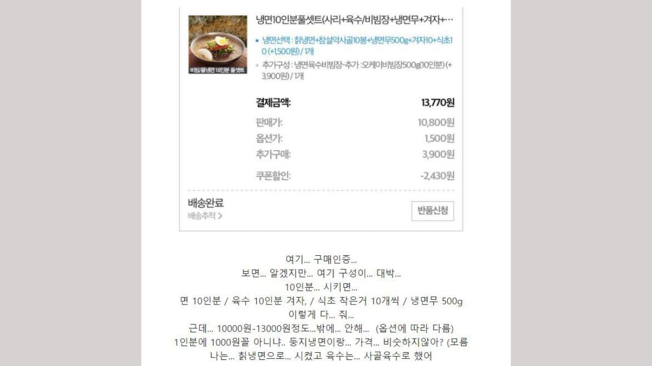 한 온라인 커뮤니티에 구매 글을 쓴 A 씨는 "냉면 10인분 밀키트를 시키면 면 10인분, 육수 10인분과 겨자·식초 10인분, 냉면 무 500g 등을 주는데 가격은 1만 원에서 13,000원 선이다"라며 1인분에 1천 원꼴이니 시제품 봉지 냉면 급 가격이라고 설명한다.