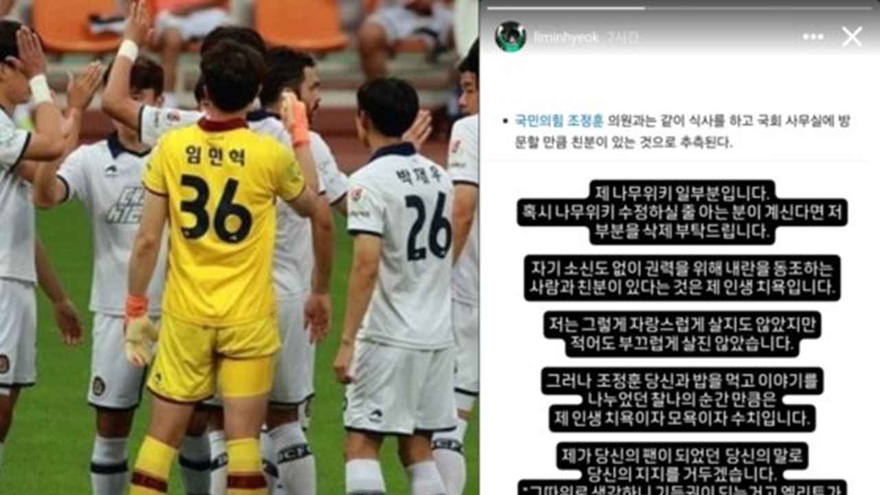 프로축구 K리그2 천안시티FC 골키퍼 출신 임민혁은 지난 9일 인스타그램을 통해 "조정훈 당신과 밥을 먹고 이야기를 나누었던 찰나의 순간은 제 인생 치욕이자 모욕이자 수치"라며 "당신에 대한 지지를 거두겠다"고 밝혔다.