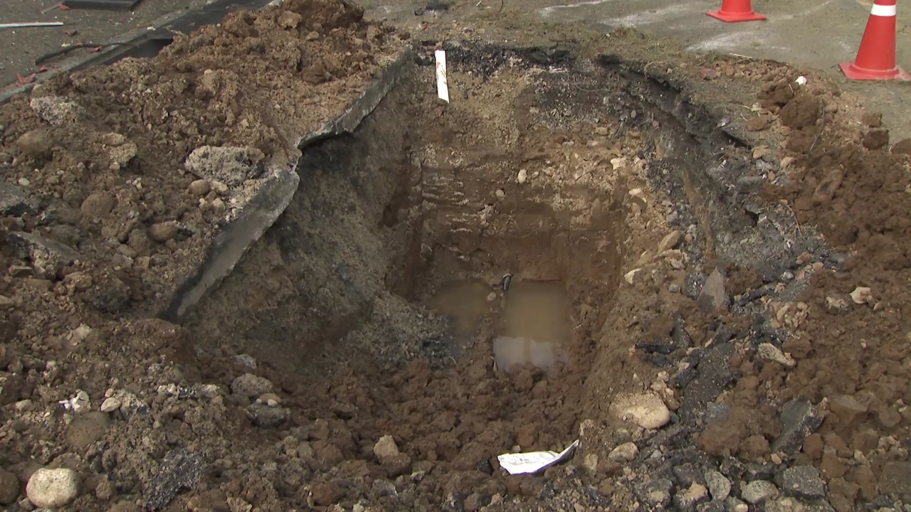 보시는 것처럼 도로 한복판, 이렇게 움푹 구덩이가 패였습니다.