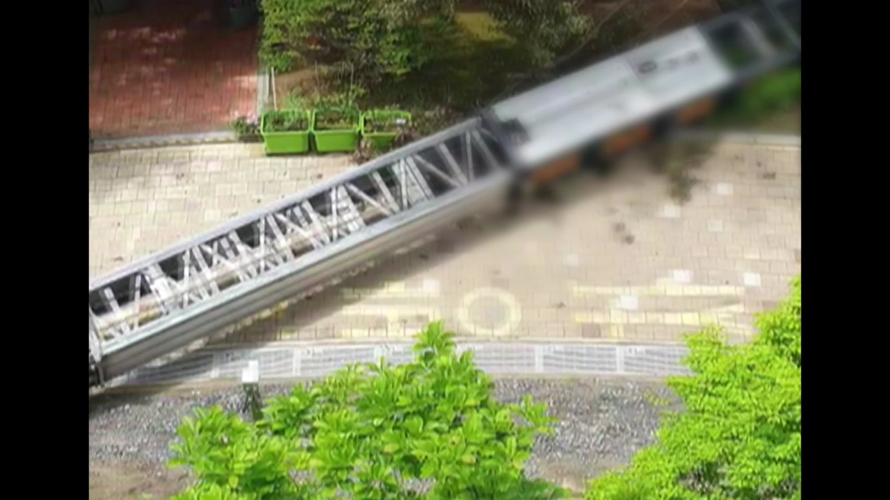 아파트 단지 안, 육중한 사다리차 한 대가 옆으로 완전히 누워 있고 주위로 노란 통제선이 쳐졌습니다.