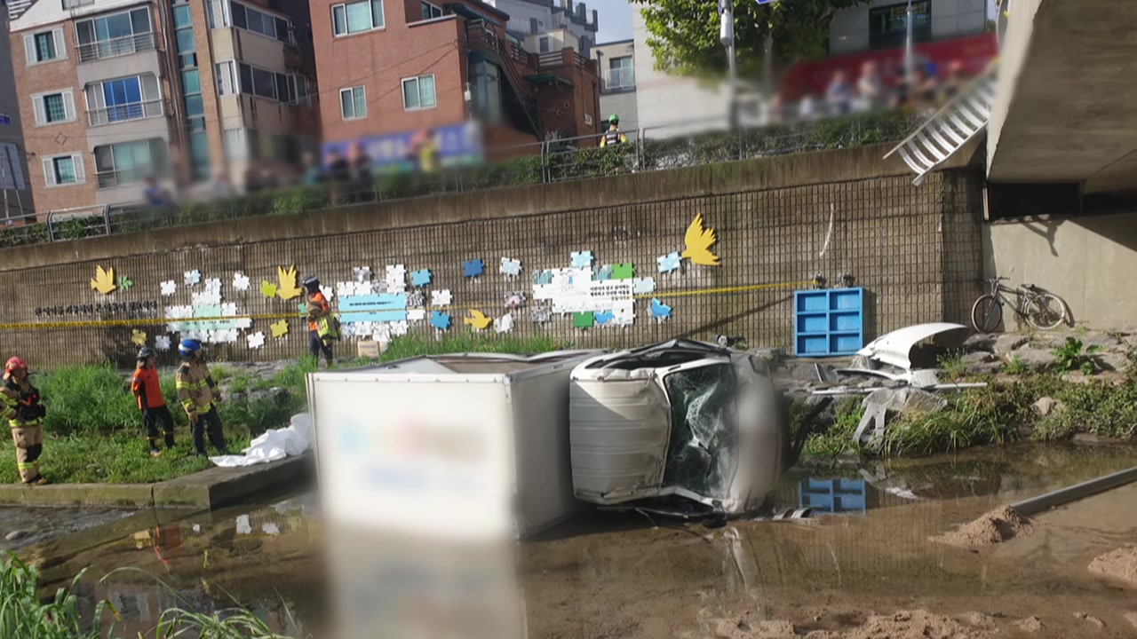 오늘(2일) 아침 7시 10분쯤 서울 동선동 보문2교 인근에서 배송트럭이 택시를 들이받고 다리 아래 하천으로 추락하는 사고가 났습니다.