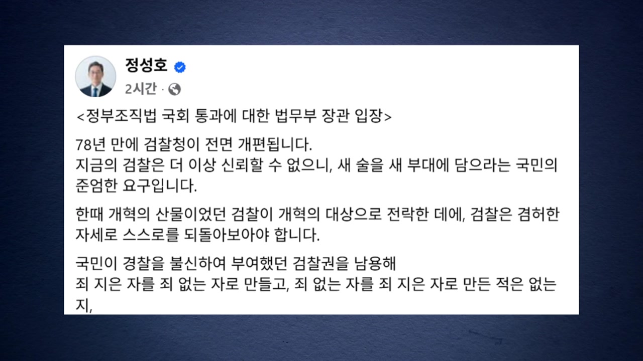 정 장관은 오늘(26일) SNS를 통해 78년 만의 검찰청 전면 개편은 지금의 검찰은 더 이상 신뢰할 수 없으니 새 술을 새 부대에 담으라는 국민의 준엄한 요구라고 설명했습니다.